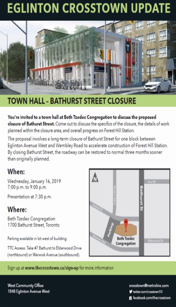 There is another community meeting planned on Jan 16 from 7:00-9:00 at Beth Tzedec Synagogue, 1700 Bathurst Street, to provide feedback to Metrolinx regarding the planned closure of Bathurst Street at Eglinton.