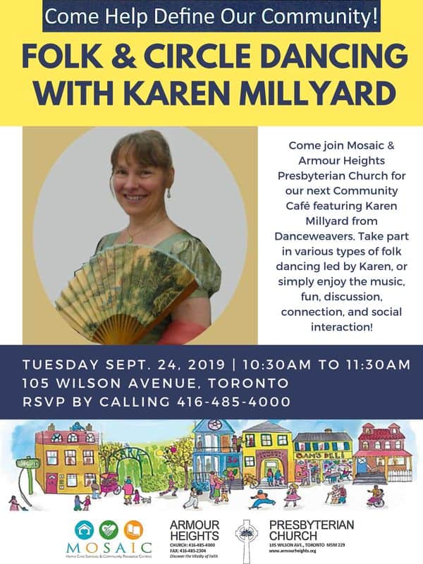 Join Mosaic & Armour Heights Presbyterian Church for the next Community Café featuring Karen Millyard from Danceweavers. Take part in various types of folk dancing led by Karen or simply enjoy the music, fun, discussion, connection and social interaction.