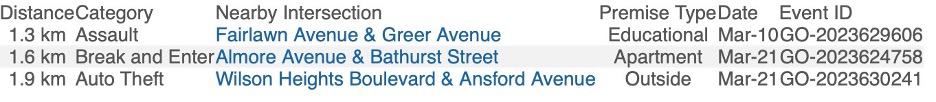 My Community Watch is a non-profit volunteer-led organization which has developed a crime app that provides a summary of crime incidents occurring within a defined geography, such as a radius around your home. The data is sourced from the Toronto Police Public Safety Data Portal. The report is free, and anyone can subscribe. You can subscribe and set up your own alert at their website https://mycommunitywatch.org