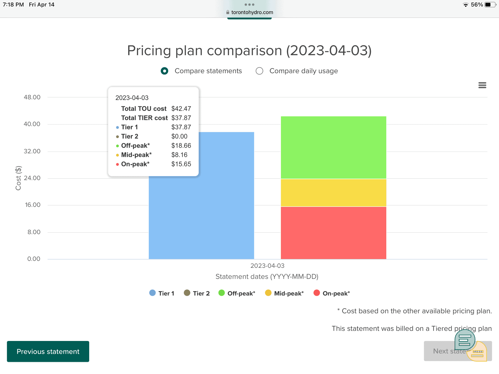 The figures below show usage over time and a comparison of the pricing plans. In this real-life example, the tiered plan was almost $5 cheaper than Time-of-Use. (Pricing reflects electricity costs, delivery is an additional cost and does NOT vary according to your price plan.)
