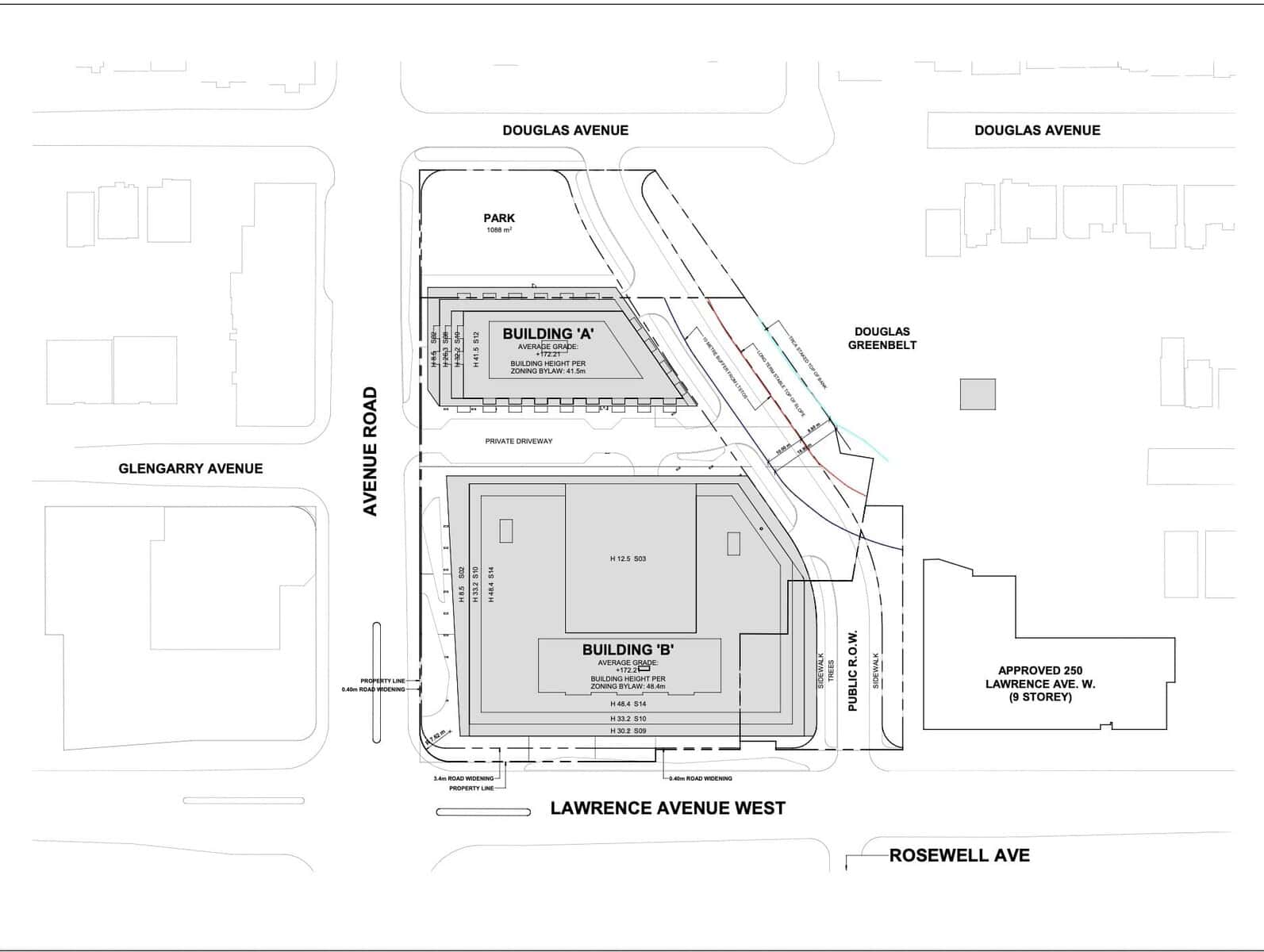 • Two condo towers – Tower B is proposed at 14 storeys and a height of 47 meters (closest to Lawrence). Tower A is proposed at 12 storeys and a height of 40 meters.